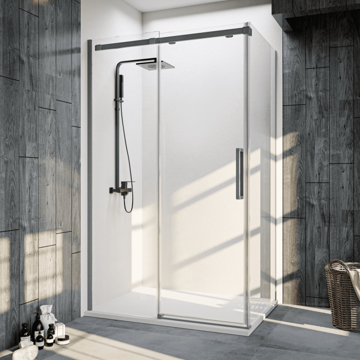 Душевое ограждение Veconi Rovigo 1500x900x1950 мм, профиль брашированный графит, стекло прозрачное, ширина входа 588 мм. Габариты регулировки (1470-1500)х(870х890)х1950 мм. Дверь 150 см, душевая стенка 90 см.