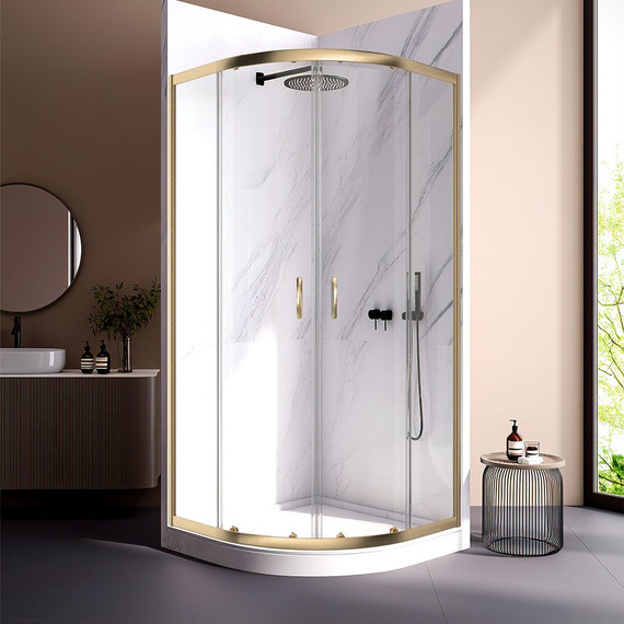 Душевое ограждение Veconi Rovigo, размер 90х90х190 см, профиль брашированное золото, стекло прозрачное, вход 513 мм. Габариты регулировки (880-890)х(880х890)х1900 мм. Поддон приобретается отдельно.