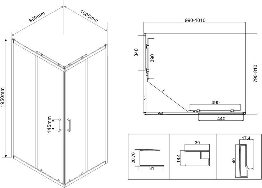 Душевое ограждение Vincea City 1000х800х1950 мм, профиль - хром, стекло - прозрачное 5 мм, ширина входа - 654 мм, габариты с диапазоном регулировок: 990-1010 x 790-810 мм. Поддон приобретается отдельно.