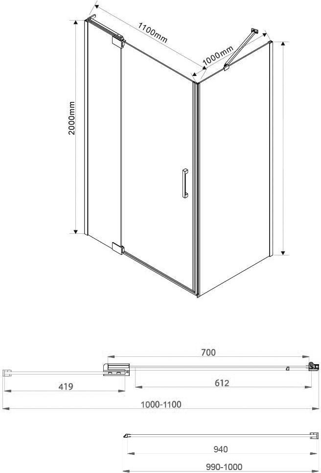 Душевое ограждение Vincea Extra 1000-1100х1000х2000 мм, профиль - хром, стекло - прозрачное 8 мм, ширина входа - 612 мм, габариты с диапазоном регулировок: 988-1088 x 970-990 мм. Поддон приобретается отдельно.
