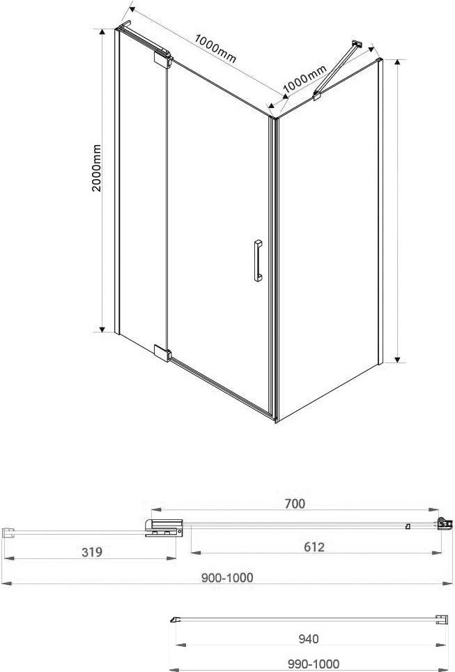 Душевое ограждение Vincea Extra 900-1000х1000х2000 мм, профиль - хром, стекло - прозрачное 8 мм, ширина входа - 612 мм, габариты с диапазоном регулировок: 888-988 x 970-990 мм. Поддон приобретается отдельно.