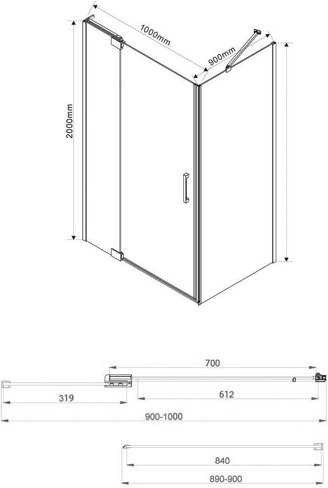 Душевое ограждение Vincea Extra 900-1000х900х2000 мм, профиль - хром, стекло - прозрачное 8 мм, ширина входа - 612 мм, габариты с диапазоном регулировок: 888-988 x 870-890 мм. Поддон приобретается отдельно.