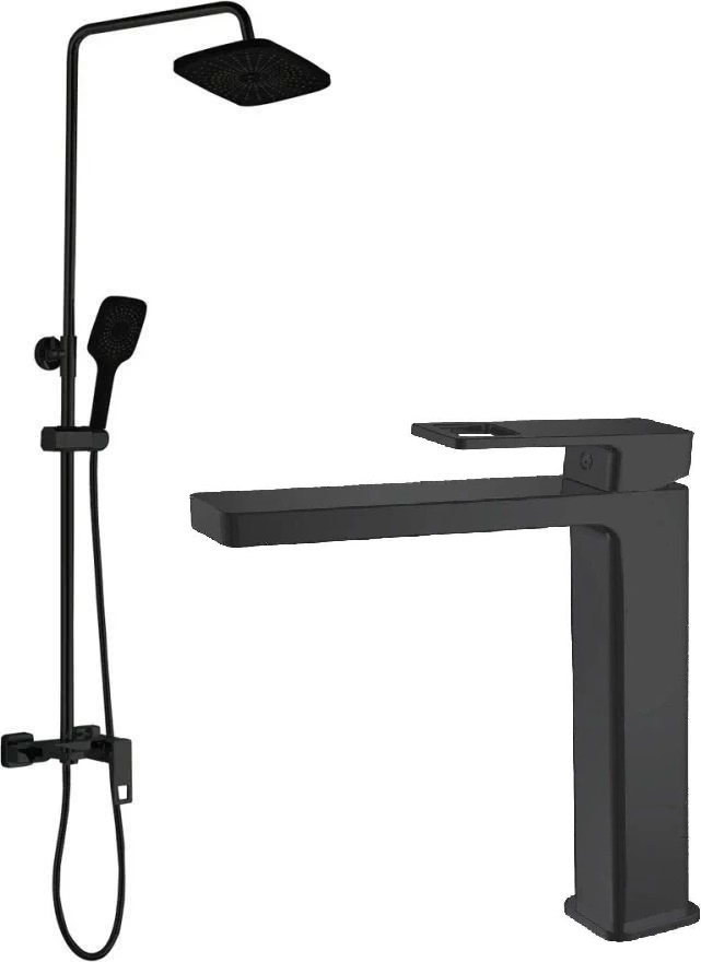 Душевой комплект Haiba: Душевая стойка HB24615-7 + смеситель для раковины высокий HB11615-7, материал латунь, цвет чёрный матовый.