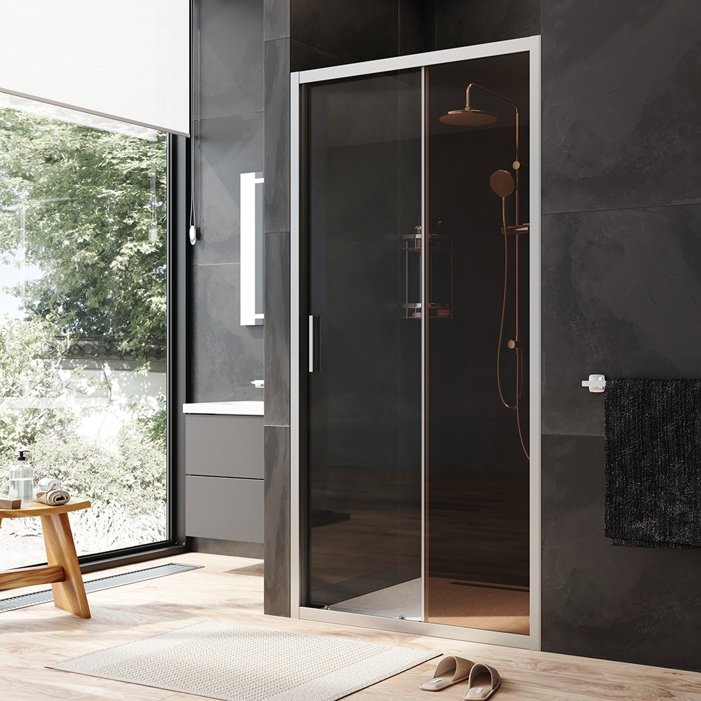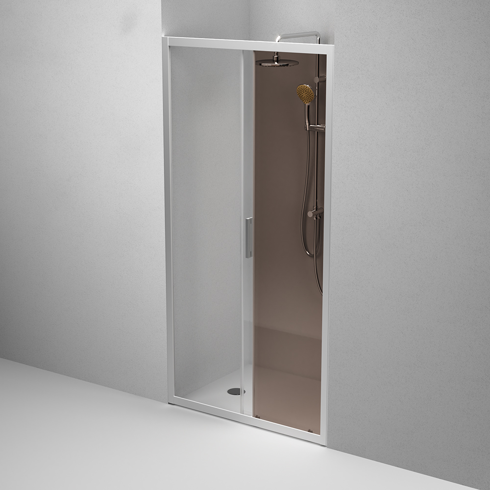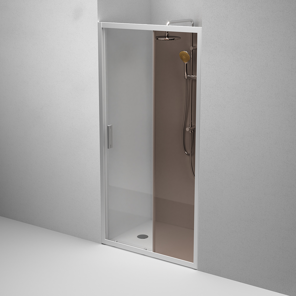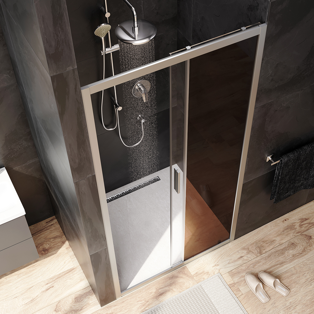 Душевая дверь отличается практичностью и функциональностью. Изделие произведено из ударопрочного закаленного стекла которое надежно фиксируется в нержавеющий алюминиевый профиль при помощи системы скрытых креплений. Ширина конструкции может быть увеличена путем регулирования каркаса на 20 мм что решает проблему неровных стен. Безупречную и плавную работу двери обеспечивают двойные металлические ролики на металлоподшипниках. Конструкция максимально герметична и предотвращает попадание воды на пол ванной комнаты.