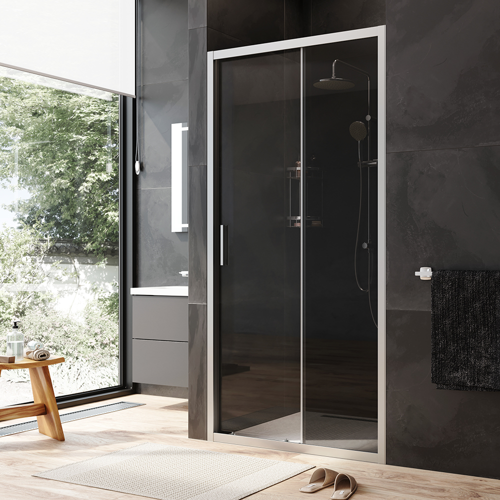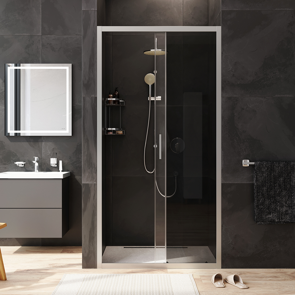 Душевая дверь отличается практичностью и функциональностью. Изделие произведено из ударопрочного закаленного стекла которое надежно фиксируется в нержавеющий алюминиевый профиль при помощи системы скрытых креплений. Ширина конструкции может быть увеличена путем регулирования каркаса на 20 мм что решает проблему неровных стен. Безупречную и плавную работу двери обеспечивают двойные металлические ролики на металлоподшипниках. Конструкция максимально герметична и предотвращает попадание воды на пол ванной комнаты.