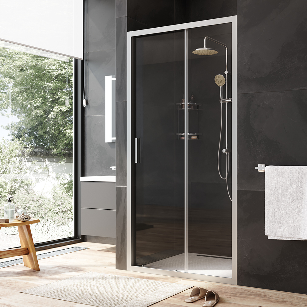 Душевая дверь отличается практичностью и функциональностью. Изделие произведено из ударопрочного закаленного стекла которое надежно фиксируется в нержавеющий алюминиевый профиль при помощи системы скрытых креплений. Ширина конструкции может быть увеличена путем регулирования каркаса на 20 мм что решает проблему неровных стен. Безупречную и плавную работу двери обеспечивают двойные металлические ролики на металлоподшипниках. Конструкция максимально герметична и предотвращает попадание воды на пол ванной комнаты.