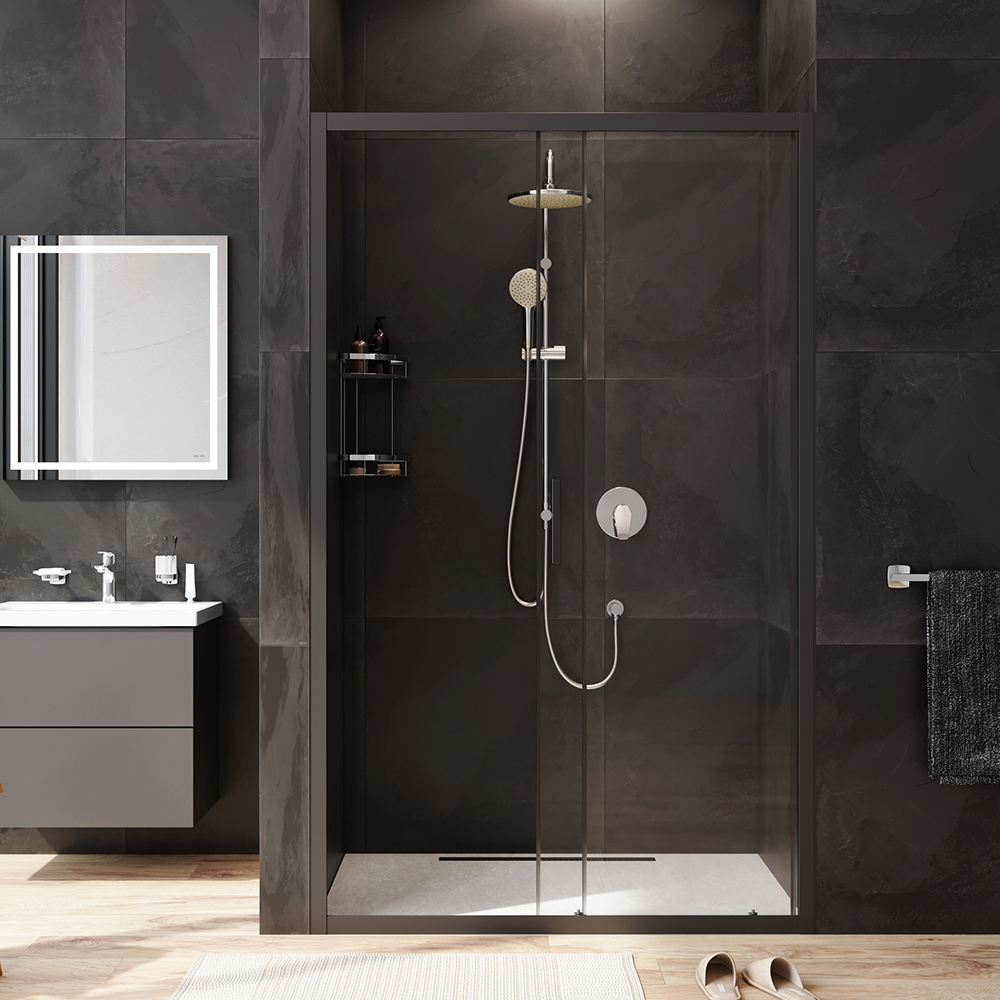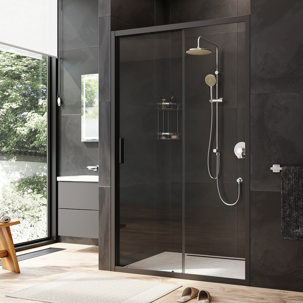 Душевая дверь отличается практичностью и функциональностью. Изделие произведено из ударопрочного закаленного стекла которое надежно фиксируется в нержавеющий алюминиевый профиль при помощи системы скрытых креплений. Ширина конструкции может быть увеличена путем регулирования каркаса на 20 мм что решает проблему неровных стен. Безупречную и плавную работу двери обеспечивают двойные металлические ролики на металлоподшипниках. Конструкция максимально герметична и предотвращает попадание воды на пол ванной комнаты.