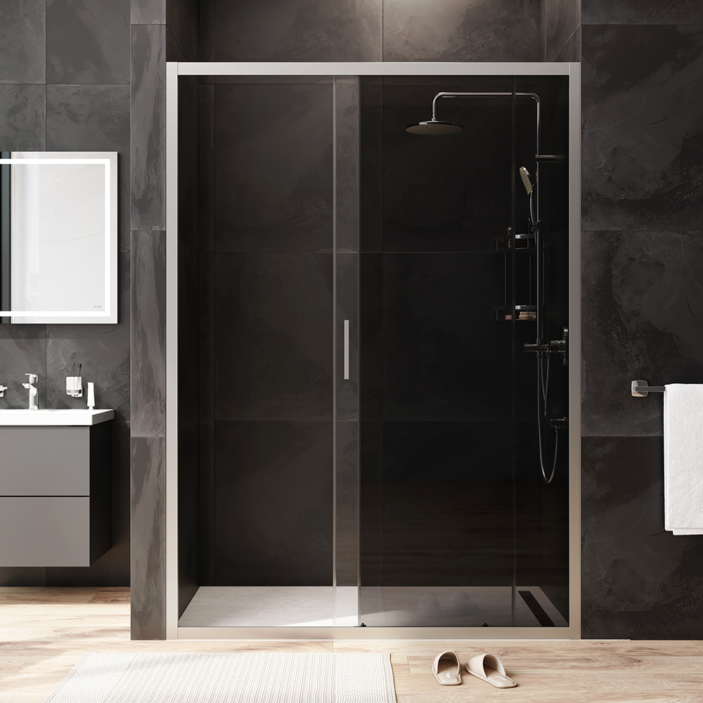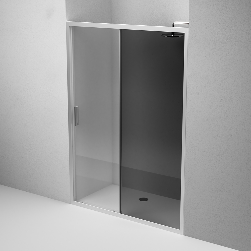 Душевая дверь отличается практичностью и функциональностью. Изделие произведено из ударопрочного закаленного стекла которое надежно фиксируется в нержавеющий алюминиевый профиль при помощи системы скрытых креплений. Ширина конструкции может быть увеличена путем регулирования каркаса на 20 мм что решает проблему неровных стен. Безупречную и плавную работу двери обеспечивают двойные металлические ролики на металлоподшипниках. Конструкция максимально герметична и предотвращает попадание воды на пол ванной комнаты.