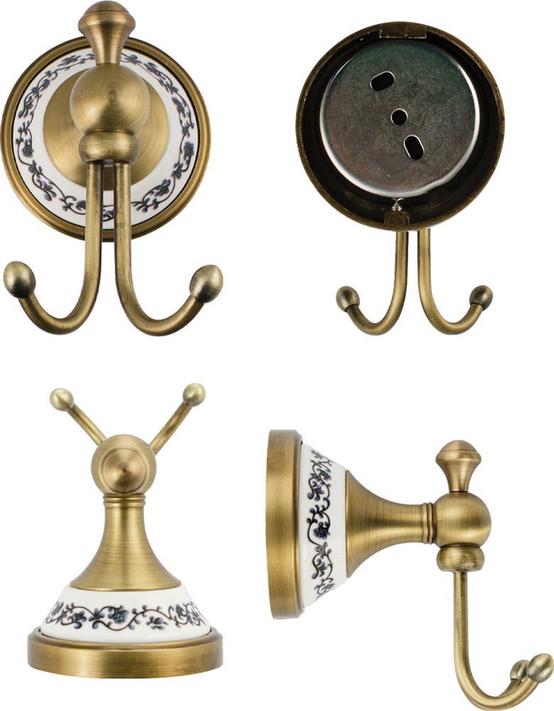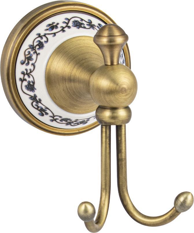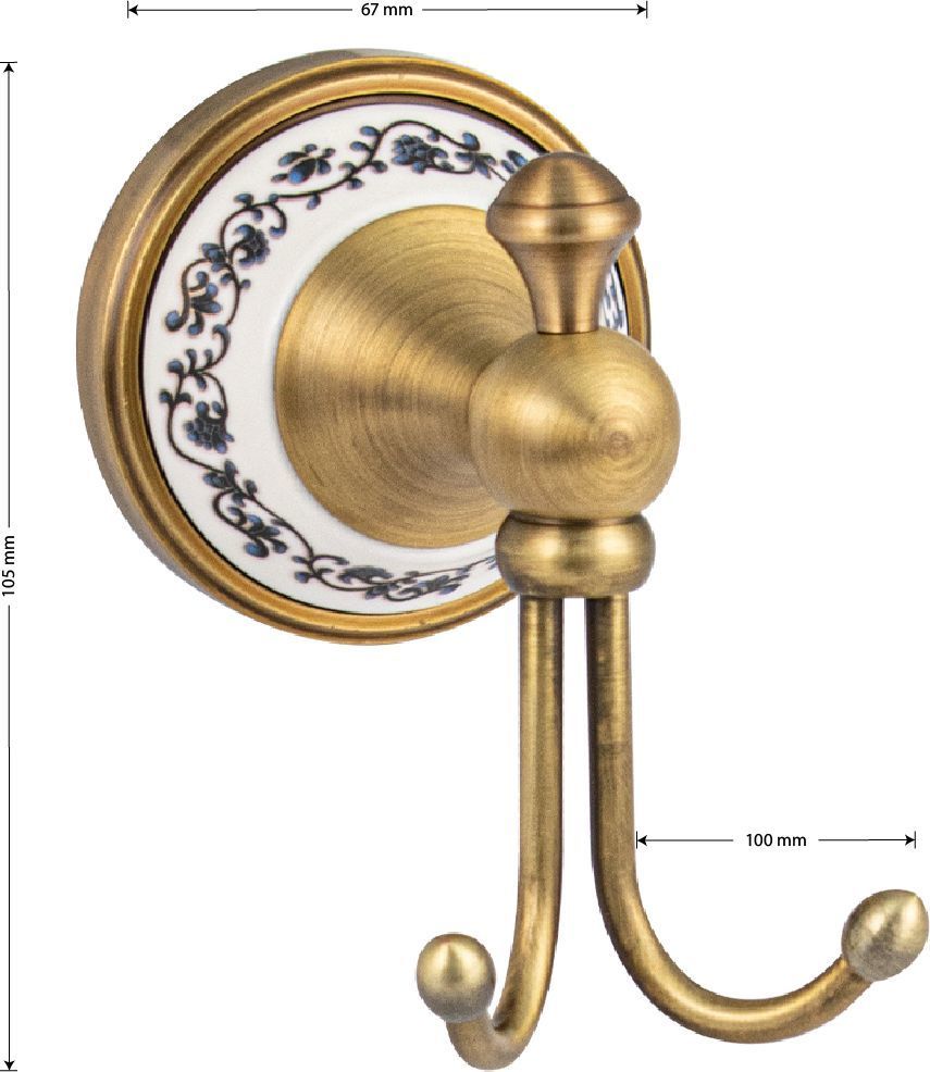 Крючок двойной для полотенец металлический, с керамической вставкой с орнаментом. Материал изготовления — ЦАМ. Имеет специальное бронзовое, матовое покрытие, которое защищает изделие от влаги и придает ему безупречный стильный вид и долговечность. На крючке с легкостью можно размещать вещи для сушки или вешать, как полотенца, так и одежду перед походом в душ. Идеально подойдет не только для ванной, но и для кухни, а также для дачи или гаража - при необходимости на держатель можно вешать любые предметы. Изделие крепится к стене с помощью дюбелей и саморезов (входят в комплект). Габаритные размеры: основание 67 мм, глубина 100 мм, высота 105 мм. Вес - 0,33 кг, объём - 0,001 м3.