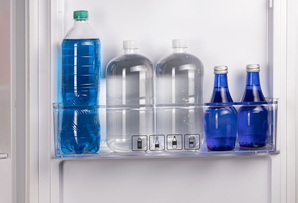 - Внутренняя посуда холодильника имеет красивый серебристый отлив и инфографику на ящиках и дверных полках.
