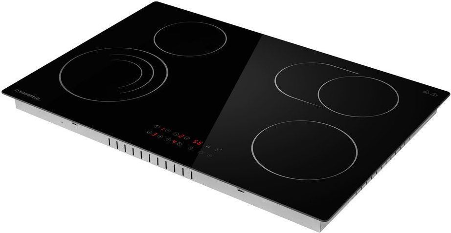 - Стильная электрическая встраиваемая варочная панель шириной 77 см выполнена из ударопрочной стеклокерамики черного цвета. Благодаря идеальной гладкости и высокой износостойкости она легко очищается.