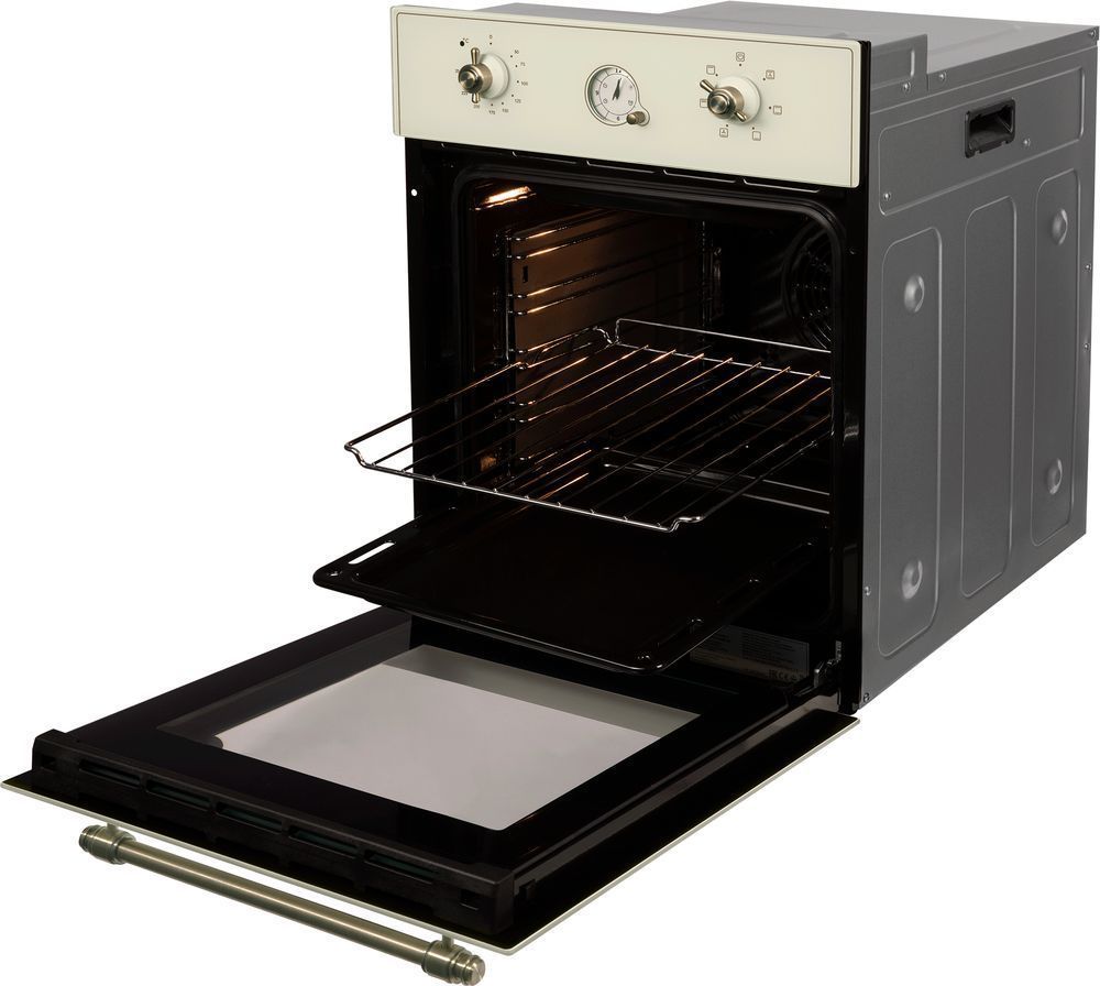 - Выбор программы и настройка температуры осуществляется за счет механического управления. Расположенные на фронтальной части корпуса поворотные ручки регуляторов обеспечивают комфортную и точную настройку температуры и режимов готовки. Переключатели и ручка двери духового шкафа выполнены в винтажном стиле в цвете под латунь.