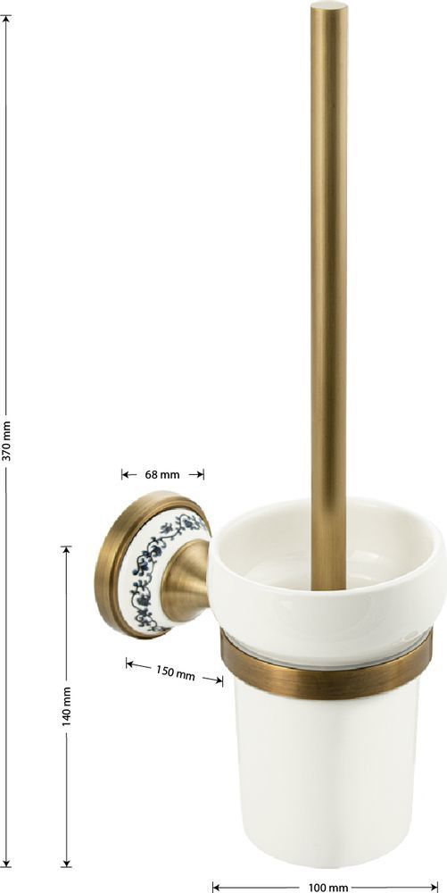 Ёрш для унитаза с керамической белой колбой, настенный, с керамической вставкой с орнаментом, необходимый аксессуар любой туалетной комнаты. Приспособление обеспечит порядок и правильное хранение гигиенических принадлежностей. Изделие выполнено из белой керамики и металла с бронзовым матовым покрытием. Жесткая щетина ерша гарантирует отличный результат очистки санузлов. Такое сочетание материалов делает конструкцию прочной и долговечной. Держатель колбы легко и удобно крепится к стене при помощи фурнитуры входящей в комплект поставки. Материал изготовления — ЦАМ. Имеет специальное бронзовое, матовое покрытие, которое защищает изделие от влаги и придает ему безупречный стильный вид и долговечность. Габаритные размеры: высота 370 мм, высота колбы 140 мм, диаметр колбы 100 мм, глубина 150 мм, основание 68 мм. Вес - 1,01 кг, объём - 0,0066 м3
