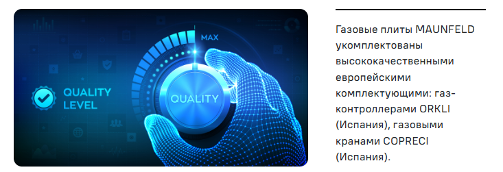 Газовые плиты MAUNFELD укомплектованы высококачественными европейскими комплектующими: газ-контроллерами ORKLI (Испания), газовыми кранами COPRECI (Испания). Данные производители являются мировыми лидерами в производстве надежных и безопасных комплектующих для газовых плит.
