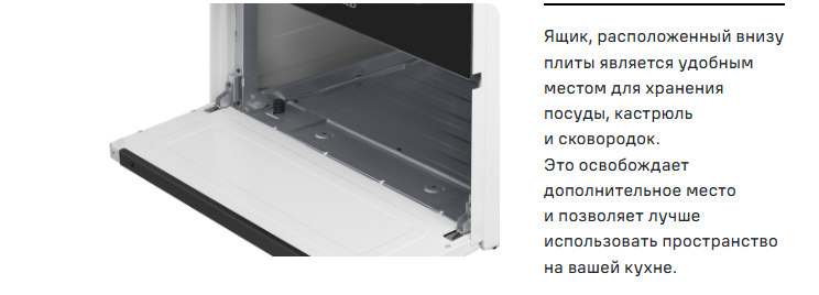 В нижней части плиты имеется удобный ящик, в котором вы можете хранить всю необходимую посуду.