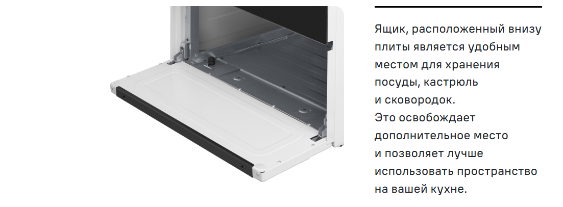 В нижней части плиты имеется удобный ящик, в котором вы можете хранить всю необходимую посуду.
