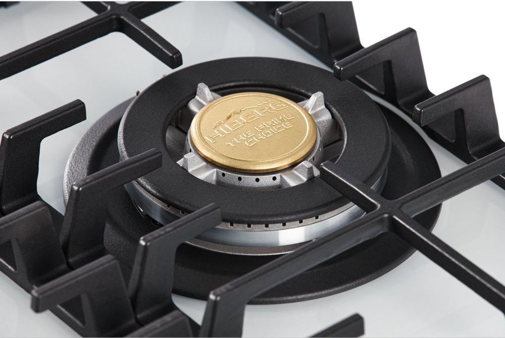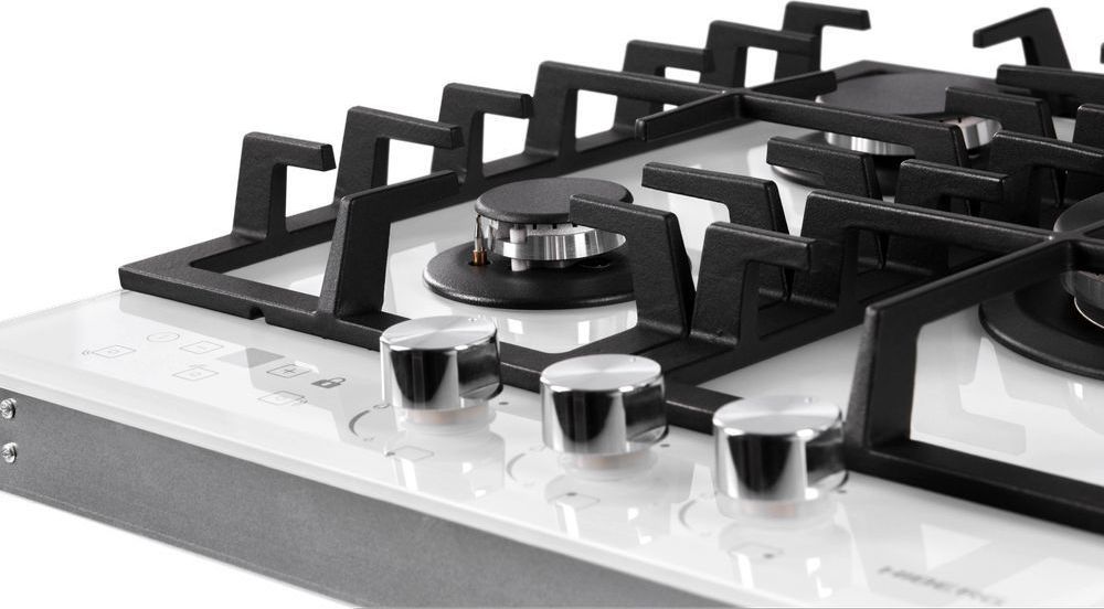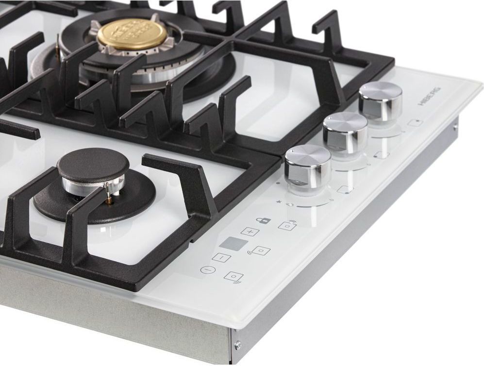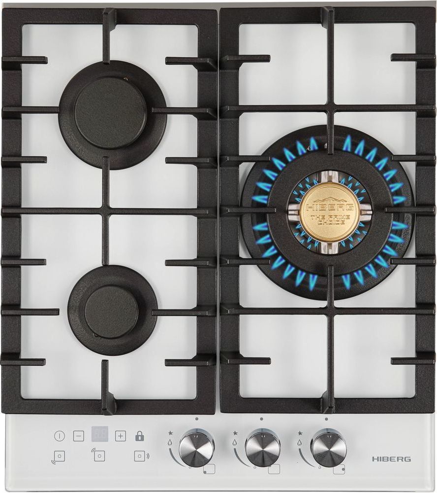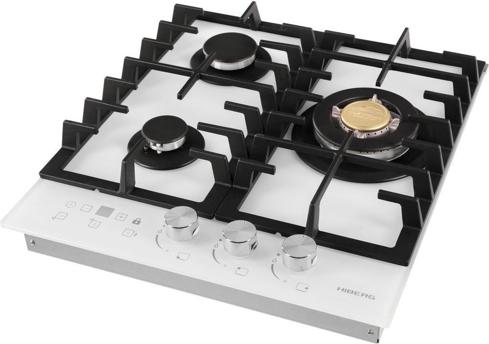 • Встраиваемая газовая варочная поверхность HIBERG VM 4535 W из закаленного стекла в белом цвете, оснащена 3 конфорками и функциями: автоматический «электророзжиг», «газ-контроль» и сенсорный таймер отключения.