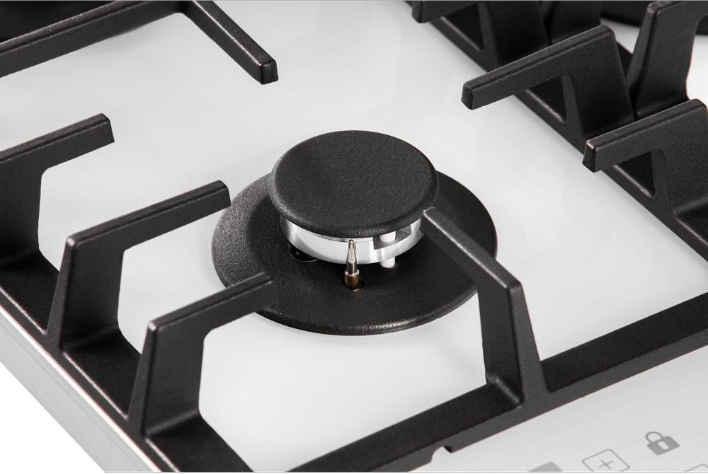 • В варочной поверхности эффективно продумана система безопасности при утечке газа. В случае пролива жидкости на варочную панель или затухания пламени от сквозняка, в конфорке срабатывает функция газ-контроль и подача газа прекращается.