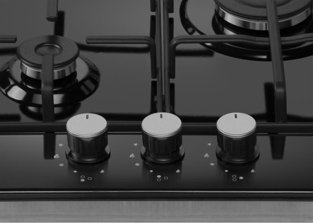 - Управление подачи газа и электроподжиг конфорок происходит с помощью поворотных регуляторов - ручек из высокопрочного термостойкого пластика. Для простоты использования около каждой ручки нанесены информационные изображения: используемая конфорка, подача газа выключена, электроподжиг, максимальное пламя и минимальное пламя.