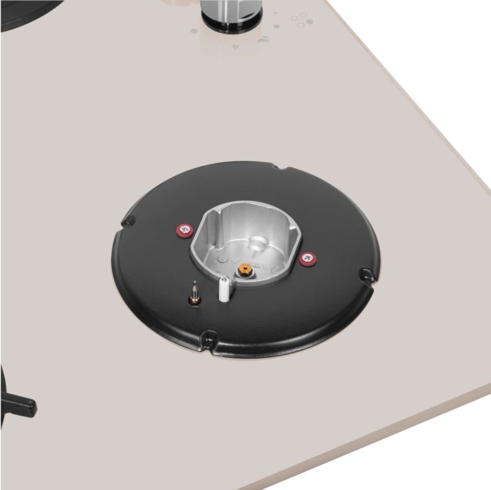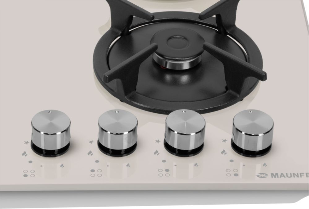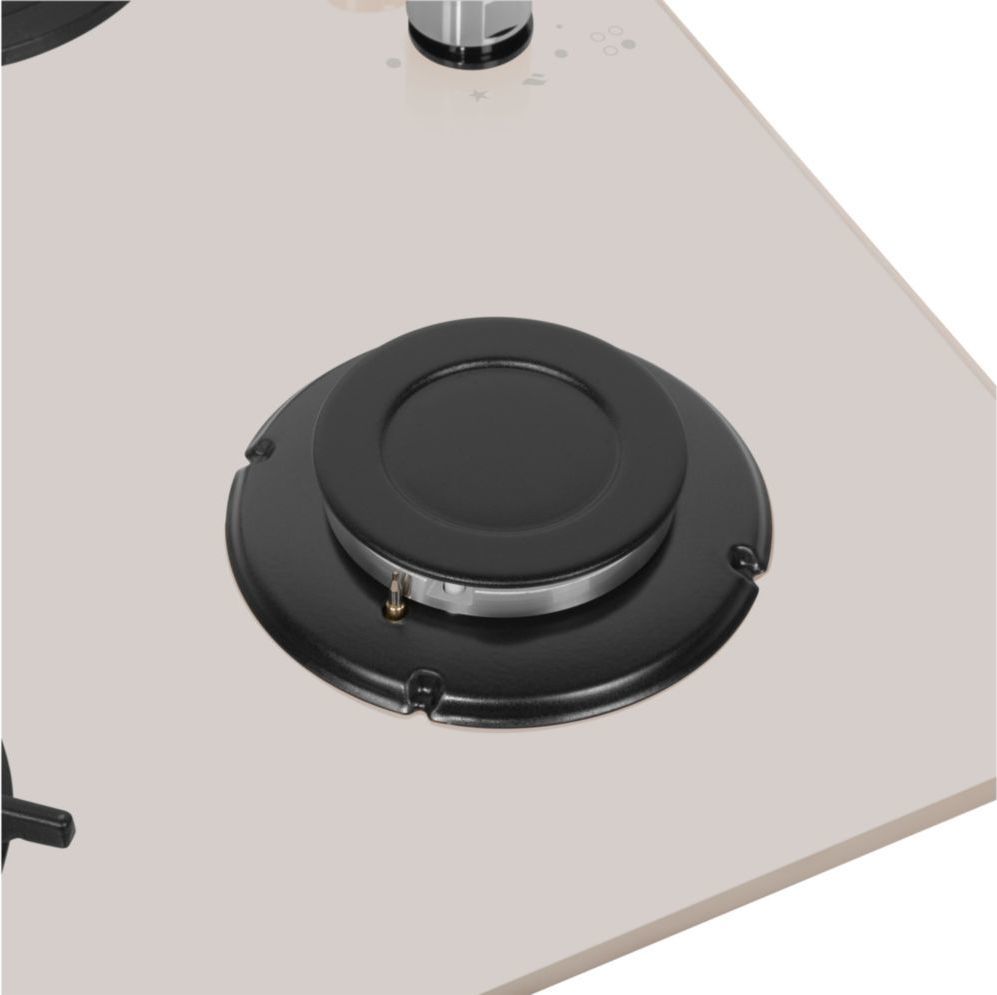 • Панель выполнена из закаленного стекла бежевого цвета. В данной модели установлены высококачественные итальянские горелки SABAF. Четыре стандартные конфорки мощностью 1000 Вт, 1700 Вт, 1700 Вт и 2600 Вт укомплектованы круглыми чугунными решетками.