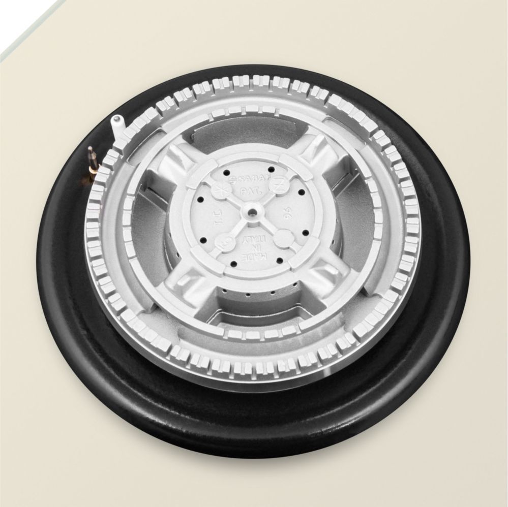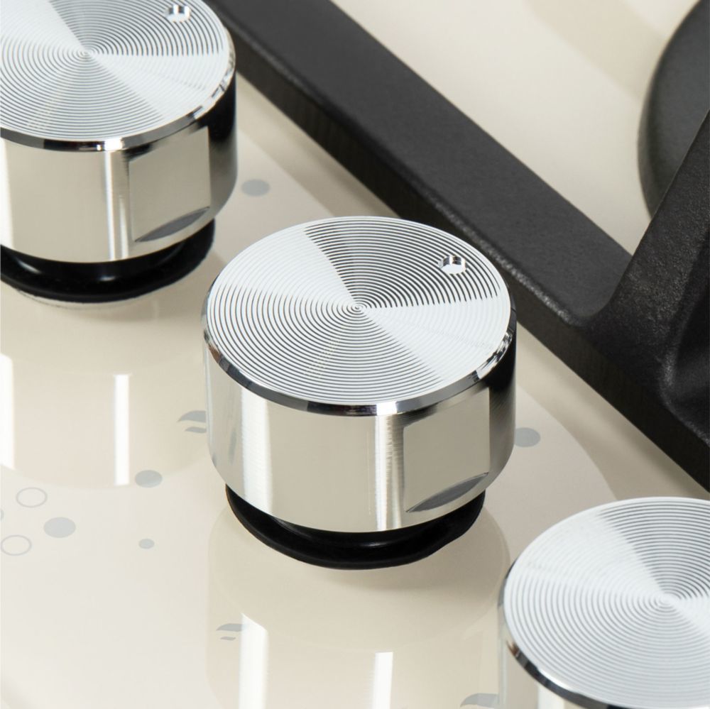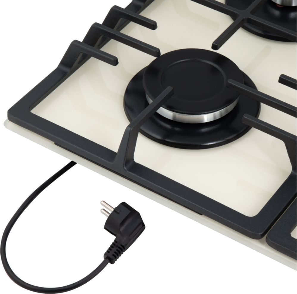 • Панель бежевого цвета выполнена из закаленного стекла, устойчивого к царапинам, сколам и постоянным перепадам температур. В данной модели установлены высококачественные итальянские горелки SABAF. Три стандартные конфорки мощностью 1000 Вт, 1700 Вт, 1700 Вт и одна  сверхмощная WOK-конфорка (3800 Вт) с двойным пламенем, спроектированные таким образом, что огонь не перегревает ни чугунные решетки, ни ручки управления.