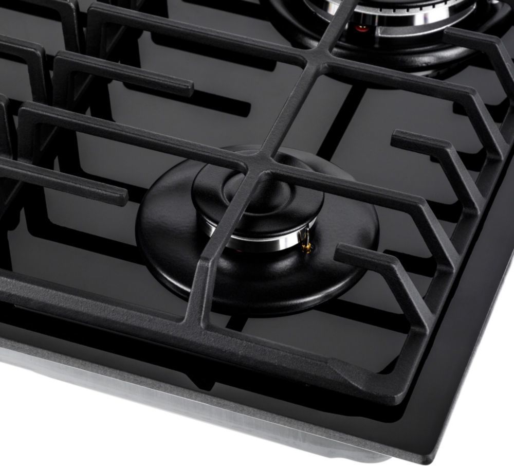 - Благодаря этому отпадает необходимость покупать специальные подставки. Решетки расположены вплотную друг к другу и образуют единую рабочую зону. Это позволяет легко и быстро сдвинуть посуду с одной конфорки на другую, не приподнимая ее.