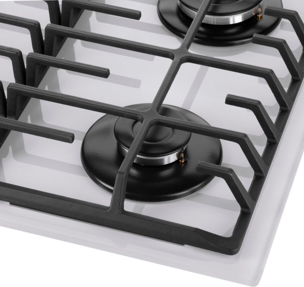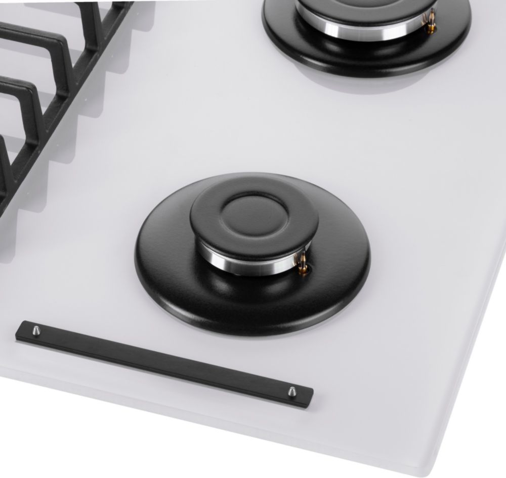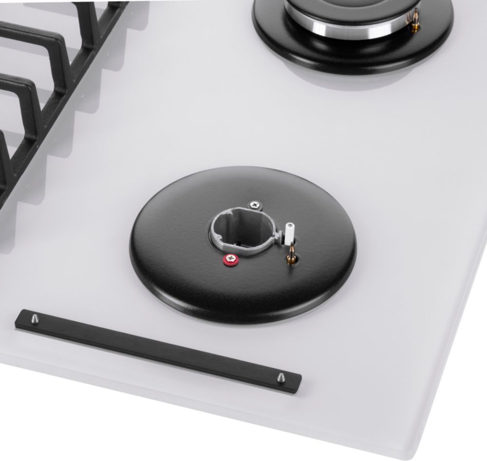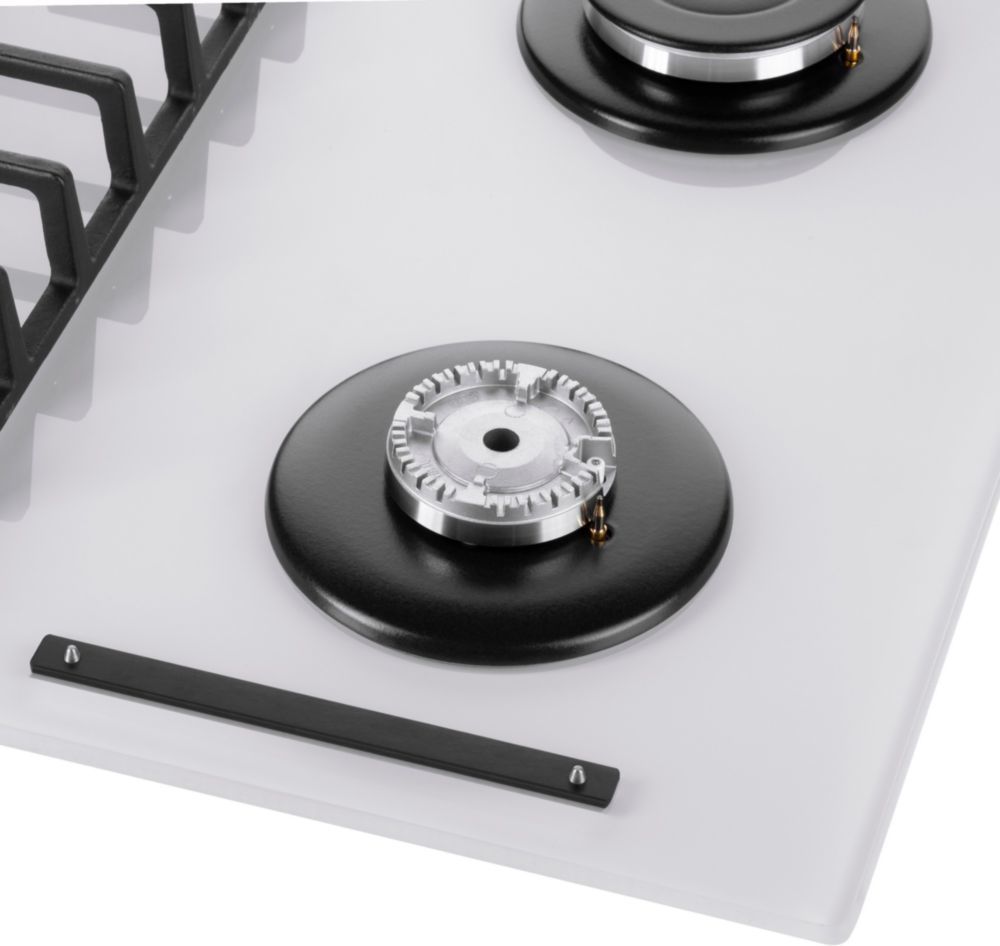 - Панель выполнена из закаленного стекла белого цвета. В данной модели установлены высококачественные итальянские горелки SABAF. Три стандартные конфорки мощностью 1700 Вт, 1700 Вт, 1000 Вт и одна WOK-конфорка с двойным пламенем мощностью 3800 Вт.