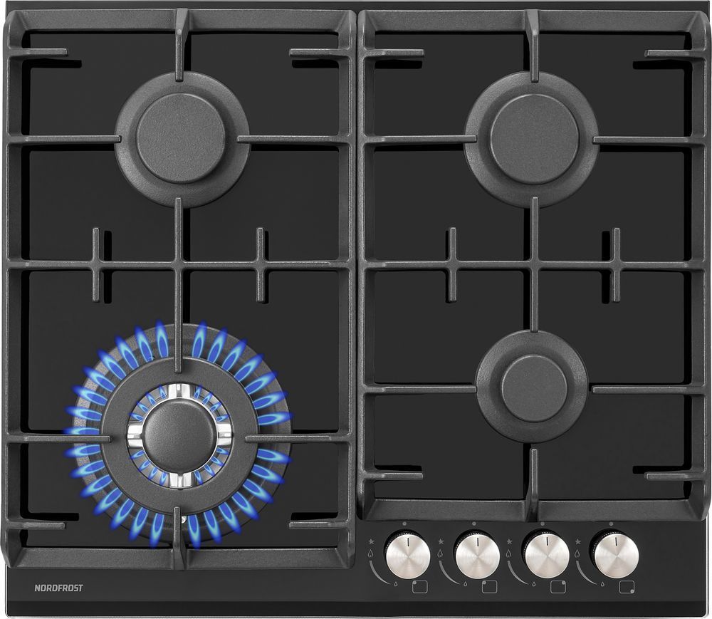 - Газовая варочная поверхность NORDFROST HM 6042 B выполнена из закаленного стекла в черном цвете, оснащена 4 конфорками с газовым подключением.