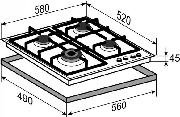 - Увеличенное расстояние между горелками (шире зона готовки) WOK-горелка вынесена ближе к переднему, краю для большего расширения зоны готовки