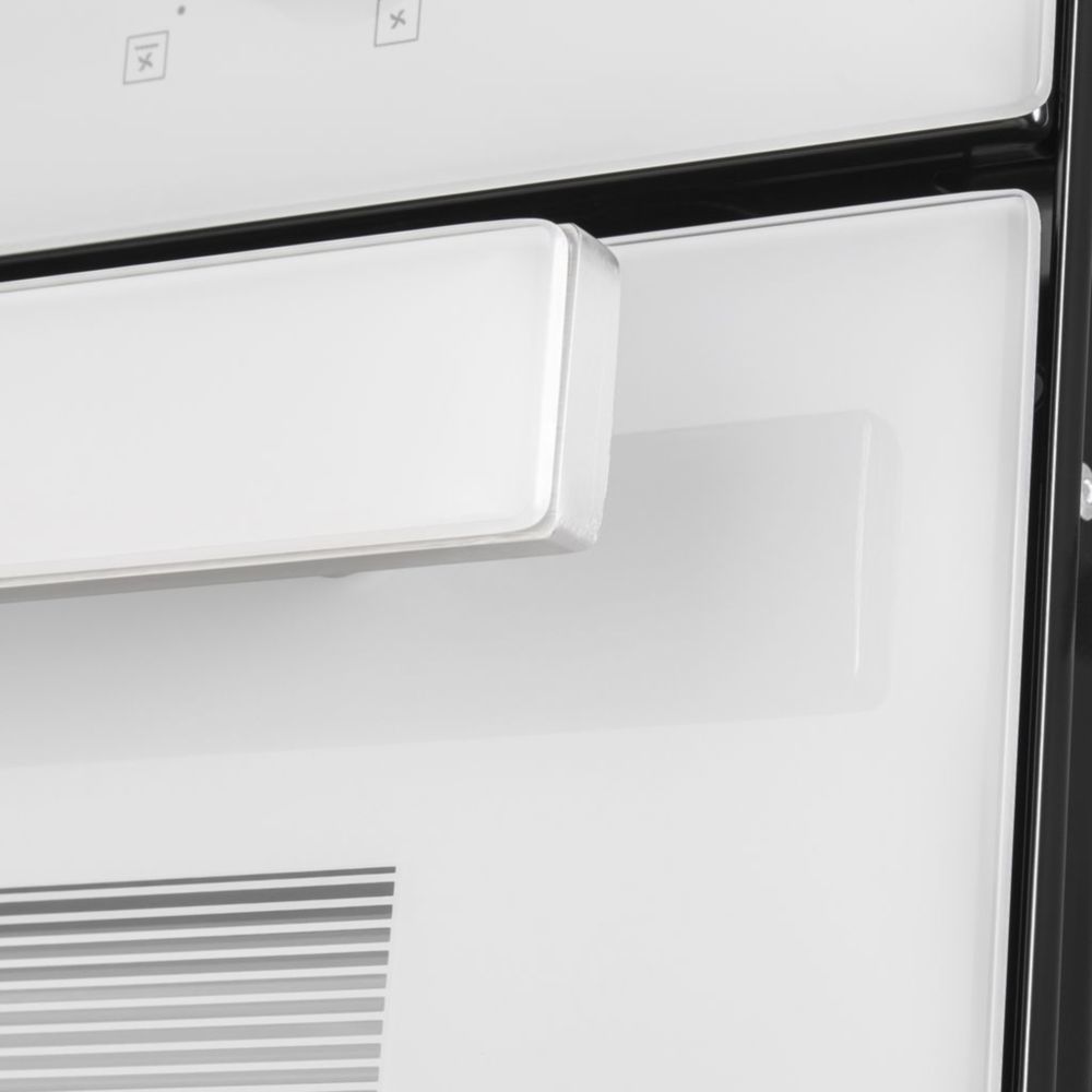 - Фронтальная панель дверцы, лицевая часть блока управления и фасад ручки дверцы сделаны из высококачественного жаропрочного стекла белого цвета, окрашенного по всему объему, что является отличительной чертой бытового прибора премиум-класса.