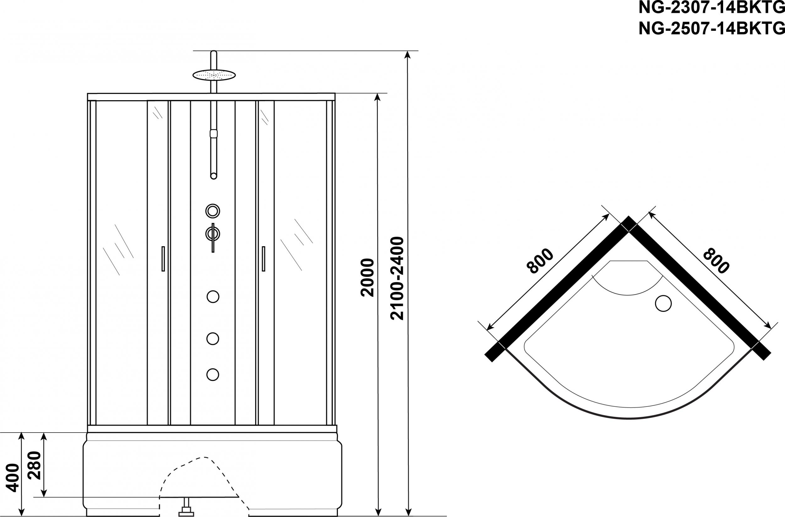 - Бессиликоновая душевая кабина Niagara NG 2307-14BKTG Без крыши с тропическим душем и гидромассажем