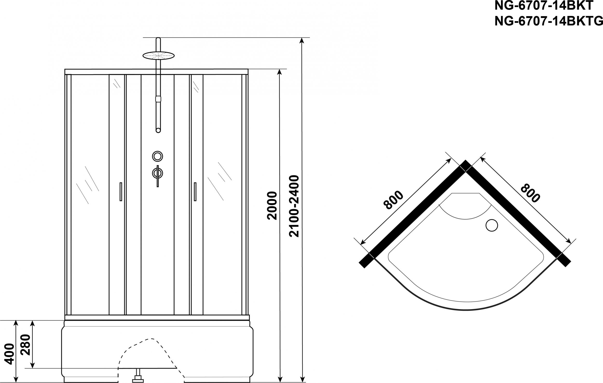 - Бессиликоновая душевая кабина Niagara NG 6707-14BKG Без крыши с гидромассажем и тропическим душем