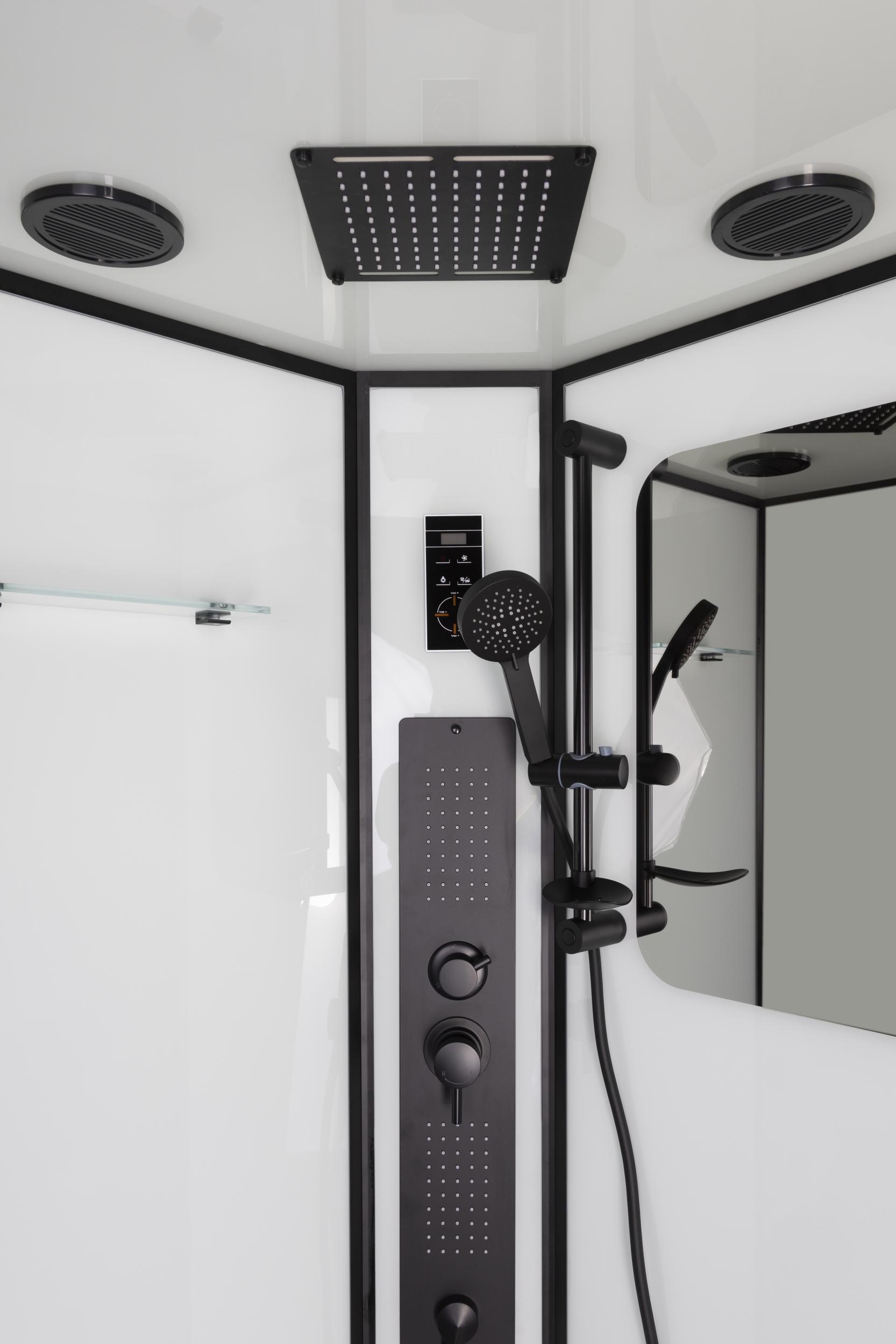 - Комплектация: Сифон, тропический душ, шланг душа, штанга, полочка, зеркало, ролики, смеситель, гидромасаж, панель управления.