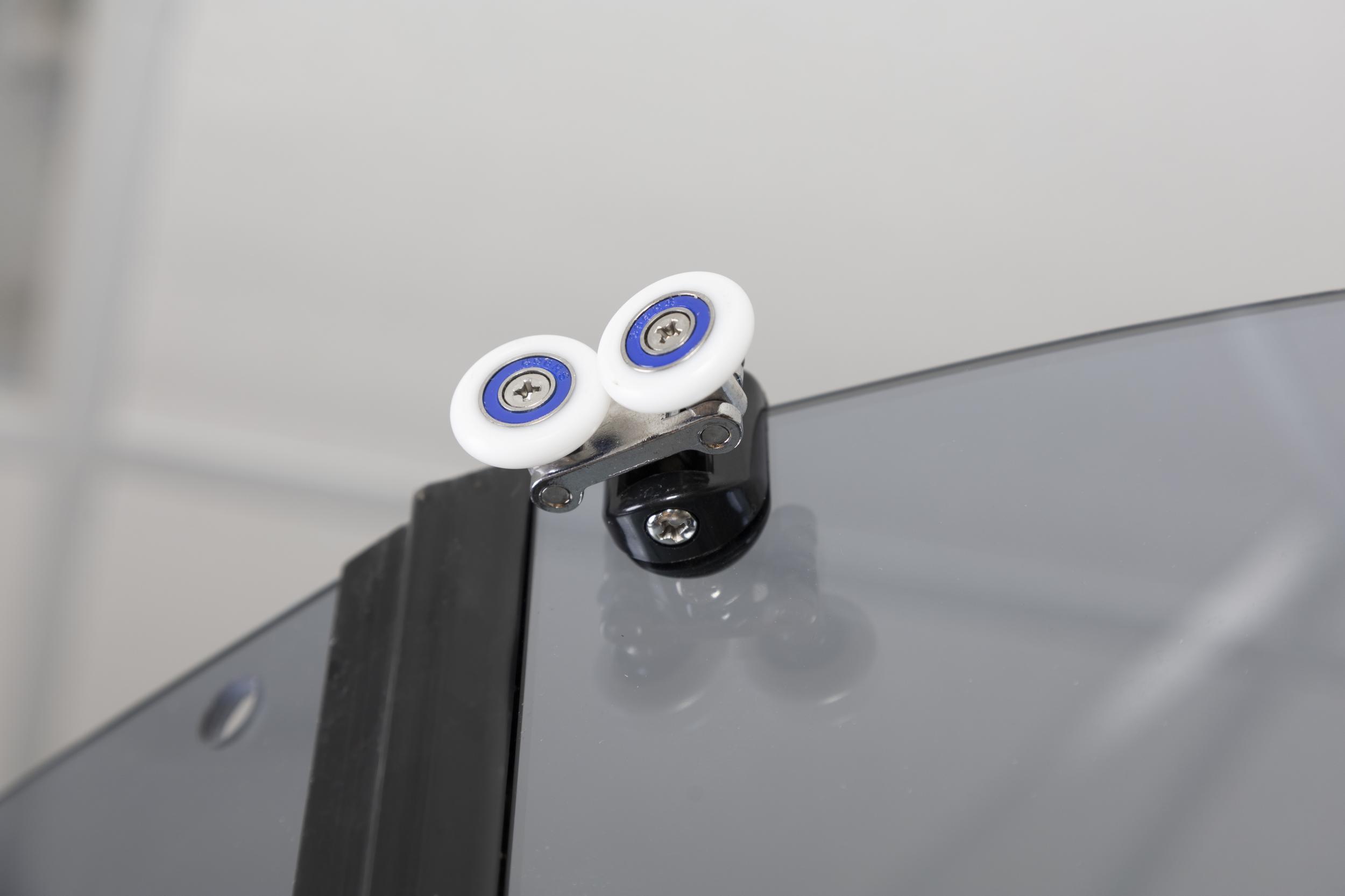 - Двери и переднее стекло: Прозрачные 6 мм, двери зарываются плотно с помощью магнитной ленты, вода не выплёскивается так как установлены брызговики между дверью и неподвижной стенкой. Ручки дверей железные. Ролики стальные и надежные.