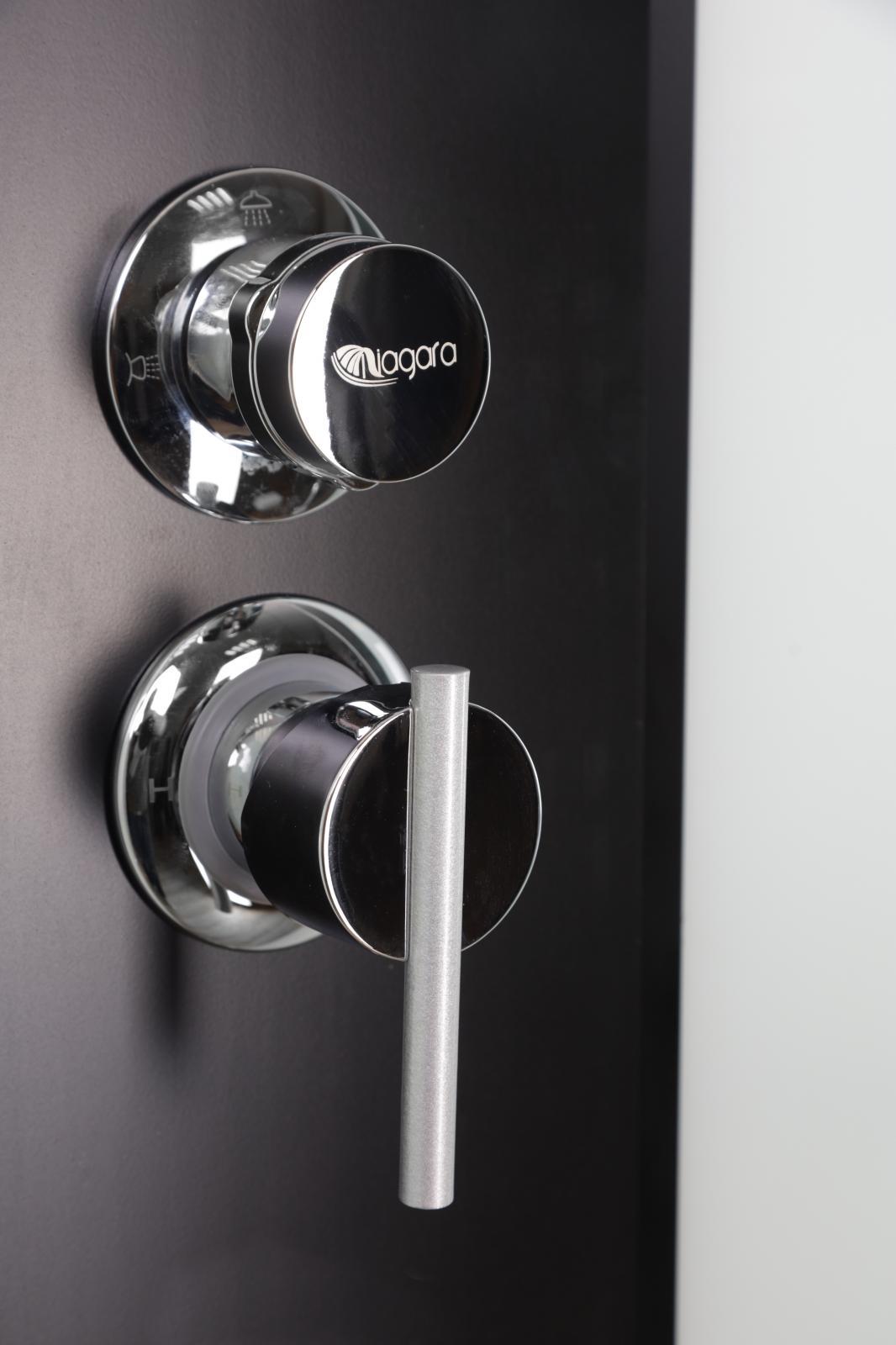 - Профиль выполнен в черном варианте, стенки и двери кабины - белые матовые. Центральная панель пластиковая черного цвета, на ней установлен смеситель с переключателем режимов.