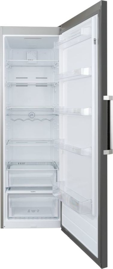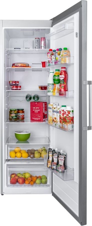 - Большой объём и функциональность: холодильная камера наполнена пятью прочными полками из закаленного стекла и двумя пластиковыми ящиками для овощей и фруктов, также на дверце находятся пять полок.