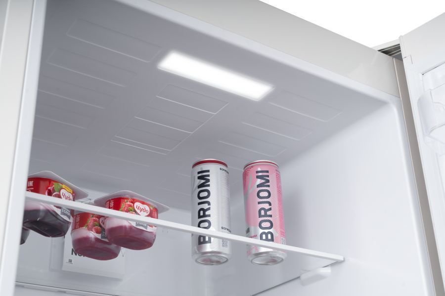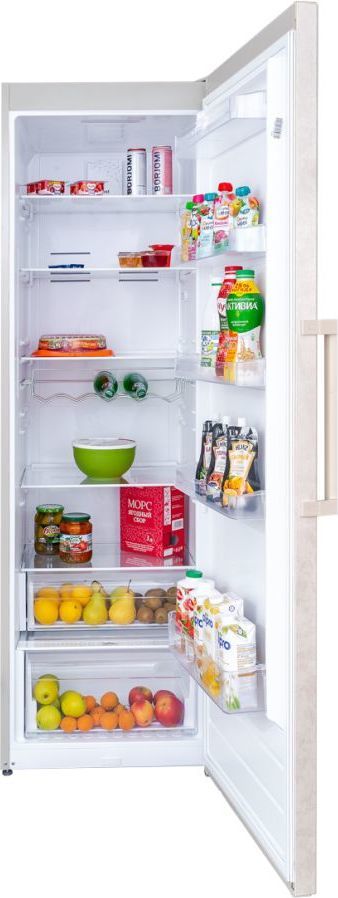 - Большой объём и функциональность: холодильная камера наполнена пятью прочными полками из закаленного стекла и двумя пластиковыми ящиками для овощей и фруктов, также на дверце находятся пять полок.