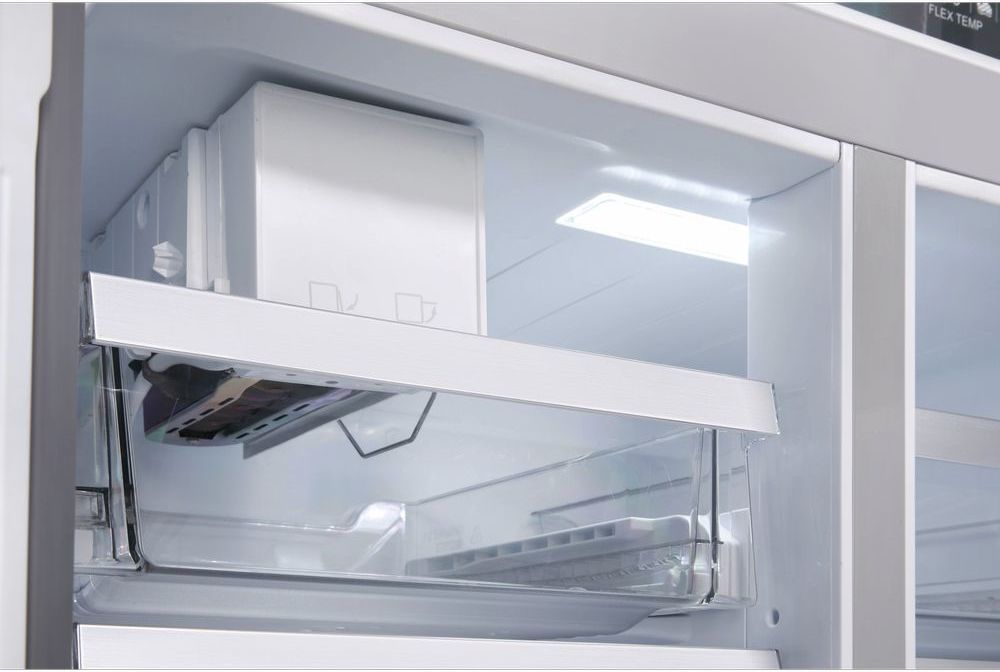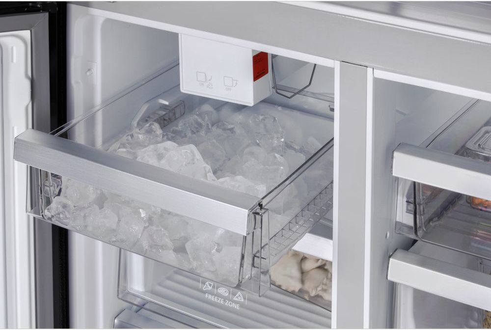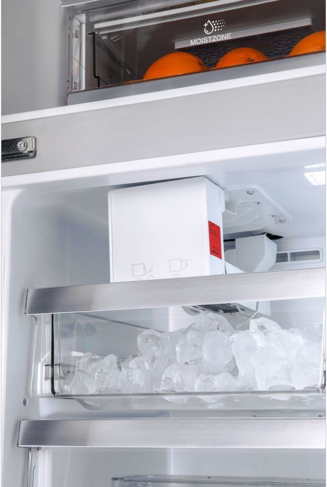 - Лед для напитков всегда будет у вас под рукой – в холодильнике есть встроенный автоматический ледогенератор с прямым подключением к водопроводу. Устройство расположено в верхней части морозильной камеры. Кубики льда собираются в специальный ящик для хранения. Ледогенератор может произвести в сутки до 1,8 кг льда, а первую порцию кубиков льда можно получить уже в течение нескольких часов, при достижении морозильной камерой установленной температуры. При полном заполнении контейнера льдом процесс останавливается автоматически.