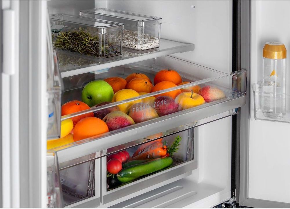 - Благодаря глубине холодильника 60 см его можно свободно встроить в кухонный гарнитур, обеспечив минимальное расстояние до кухонных шкафов всего в 5 мм. С системой нижнего отвода тепла стенки соседних шкафов не будут нагреваться. С помощью специальных дверных петель и обновленной конструкции двери модели открываются на 90 градусов, что обеспечивает удобный доступ к продуктам.