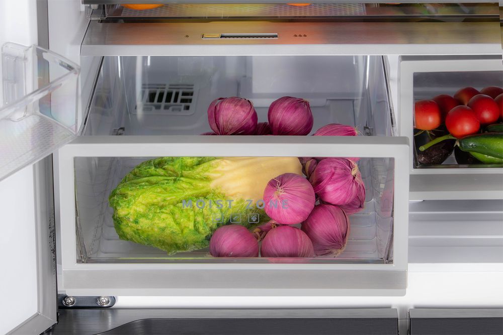 - Мембранная технология автоматического поддержания уровня влажности до 90% в ящиках холодильной камеры улучшает условия хранения овощей, фруктов и зелени. Продукты дольше сохраняют все полезные свойства и естественную свежесть. Уровень влажности можно регулировать с помощью специального бегунка, расположенного рядом с ящиком.