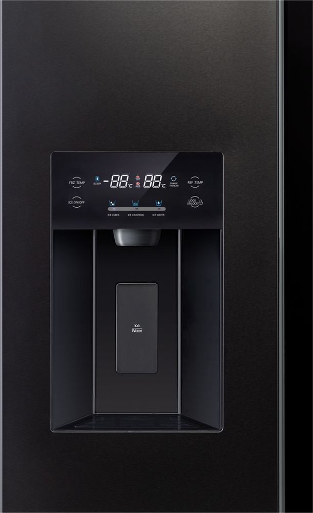 - На двери холодильника расположен ультрасовременный цветной LED-дисплей. Удобное сенсорное управление позволяет легко выставить необходимые настройки и параметры работы холодильника: переключение режимов, включение/выключение функции ледогенератора ICE MAKER, индикатор контроля уровня воды, выбора зоны охлаждения и др.