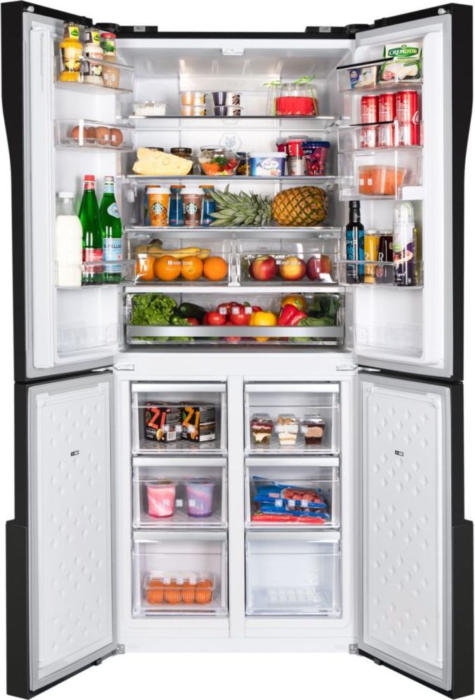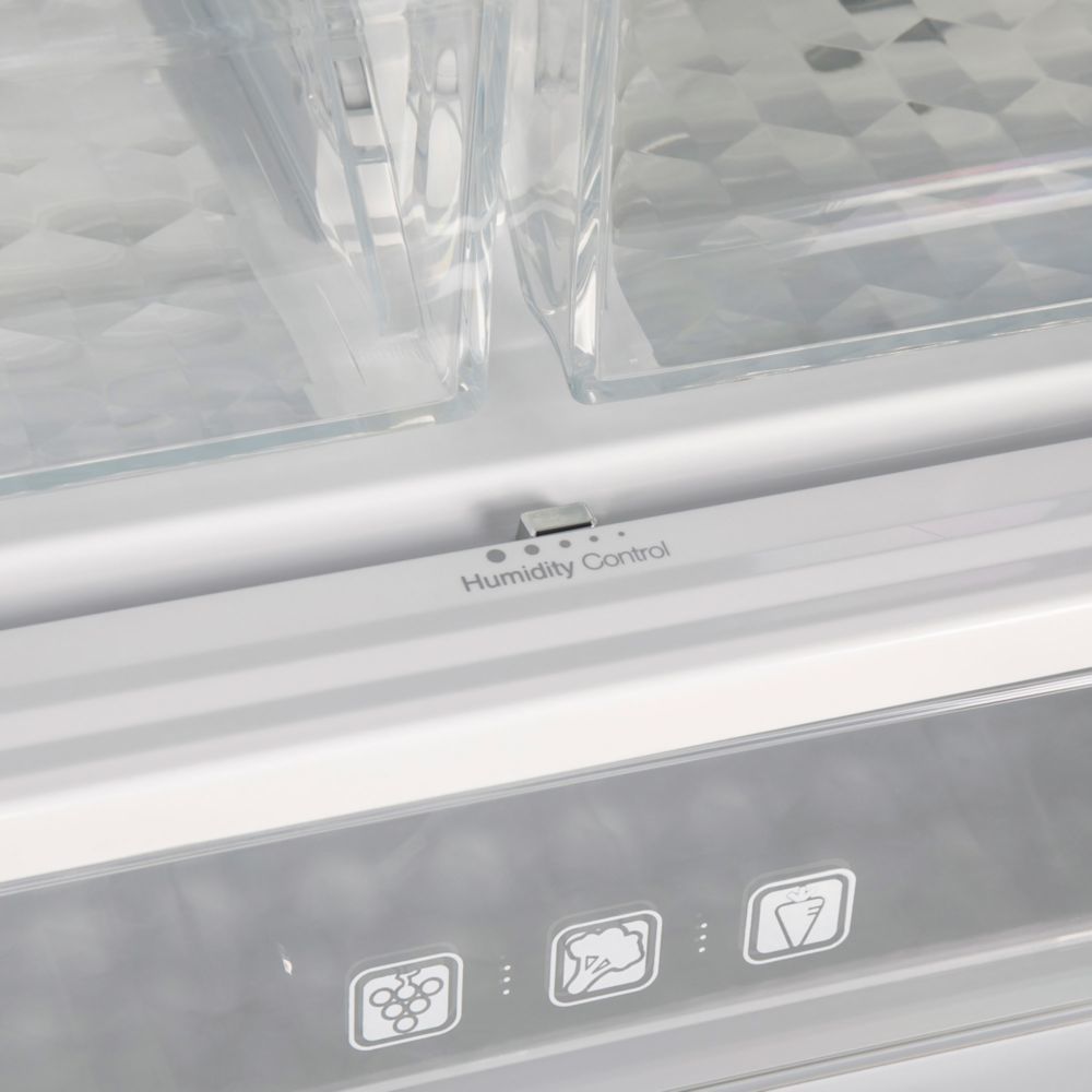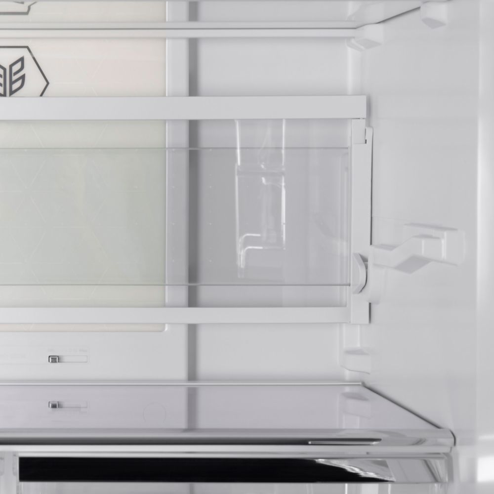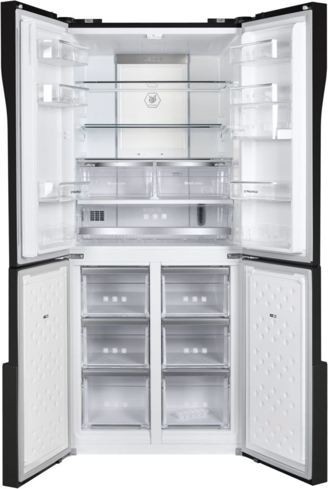 - Корпус белого цвета высотой 182 см имеет ширину 78 см и сделан из металла. Фасады всех четырех дверей сделаны из закаленного стекла белого цвета. Внутренняя часть выполнена из антибактериального белого пластика легкой очистки и укомплектована устройством фильтрации «LECO», обеспечивающего увеличение времени хранения продуктов и продление свежести фруктов и овощей.