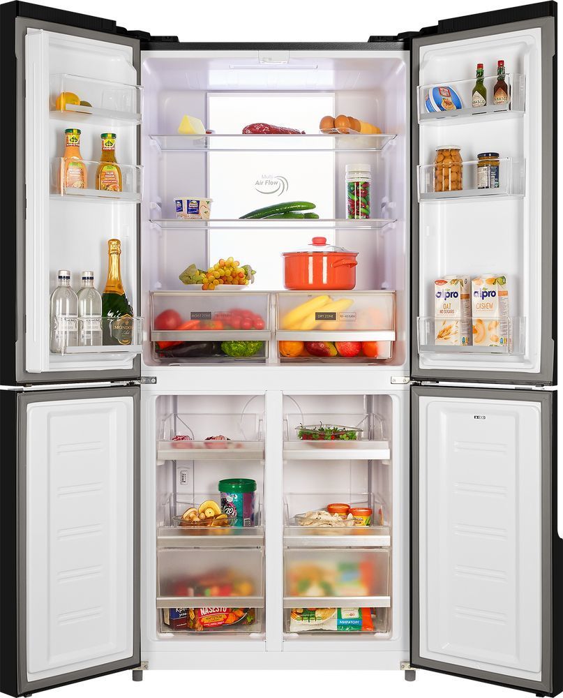 - 4-х дверный холодильник имеет единое пространство верхних полок холодильной камеры, чтобы удобно было размещать габаритные кастрюли и контейнеры. Прочные полки из закаленного стекла можно регулировать по высоте, а ящики в холодильной камере предназначены для хранения овощей и фруктов и оснащены влажной зоной свежести и сухой.