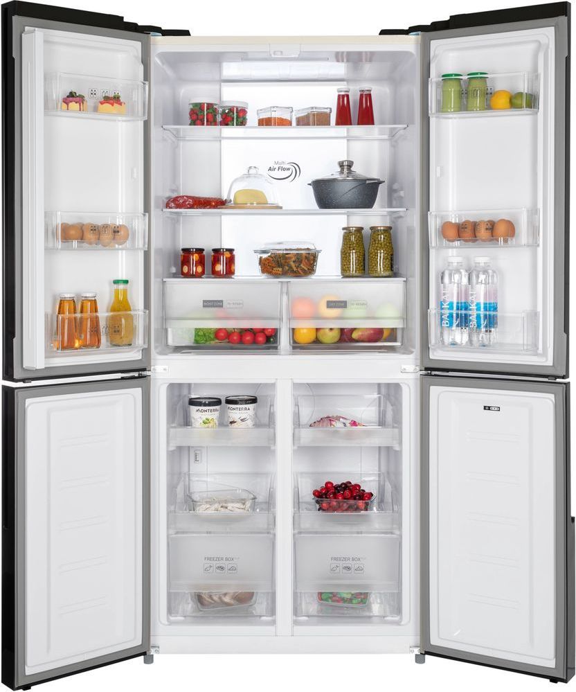 - 4-х дверный холодильник имеет единое пространство верхних полок холодильной камеры, чтобы удобно было размещать габаритные кастрюли и контейнеры. Прочные полки из закаленного стекла можно регулировать по высоте, а ящики в холодильной камере предназначены для хранения овощей и фруктов и оснащены влажной зоной свежести и сухой.