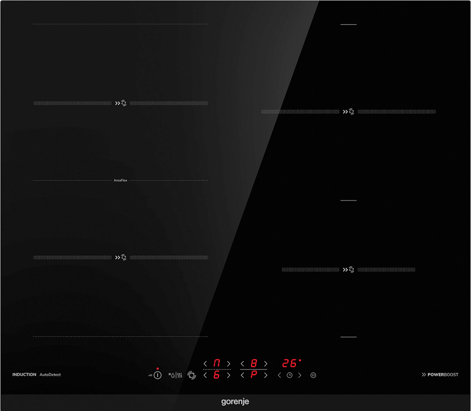 Модель оборудована 4 конфорками разных мощностей с возможность объединения двух левых конфорок в две большие зоны AreaFlex. Это позволяет готовить в больших кастрюлях и сковородах, жарить на гриле. После включения в течение первых 10 секунд прибор автоматически определяет место установки посуды и включает необходимую зону нагрева — отдельно или совместно с другой в зависимости от размера дна.
