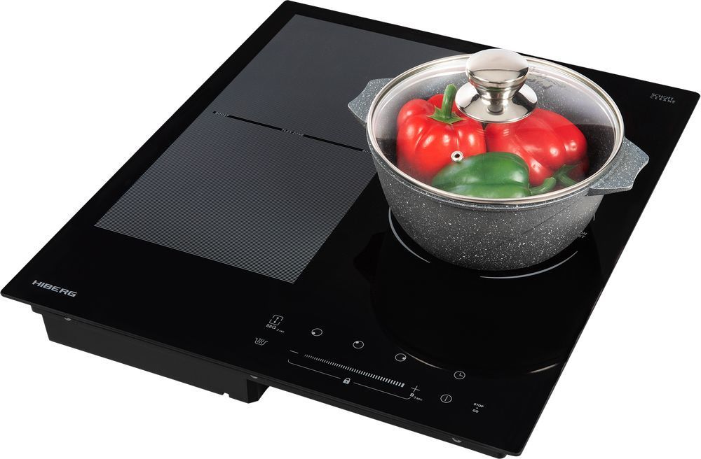 - Встраиваемая индукционная варочная поверхность HIBERG i-MS 4539 B выполнена из немецкой стеклокерамики Schott ceran и оснащена 3 конфорками с сенсорным слайдерным управлением.