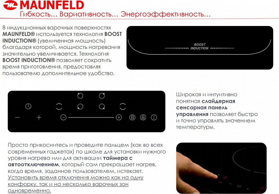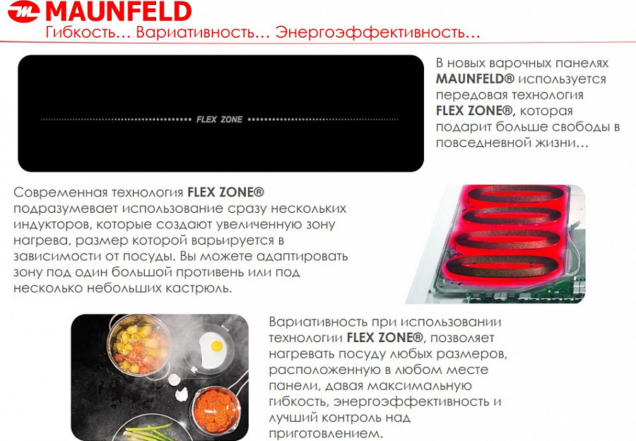 - Совместимость с посудой любого размера и формы Flex Zone, 2 "моста" попарно объединенные левые и правые зоны нагрева.