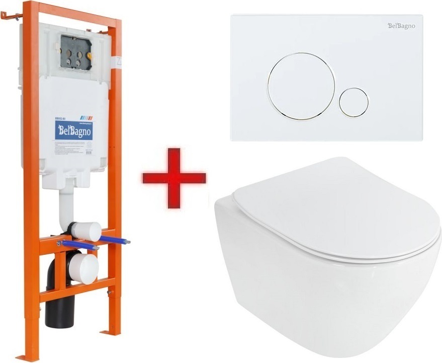 Инсталляция BelBagno BB002-80 с подвесным безободковым унитазом Cezares Stylus CZR-513-TH-R, сиденье с тонкой крышкой микролифт, крепление, кнопка смыва Sfera, белая.