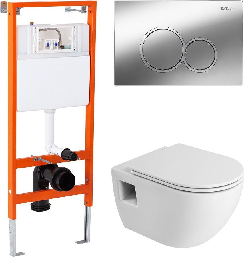 Инсталляция BelBagno с подвесным безободковым унитазом Cezares Eco, сиденье с крышкой микролифт, кнопка смыва хром.