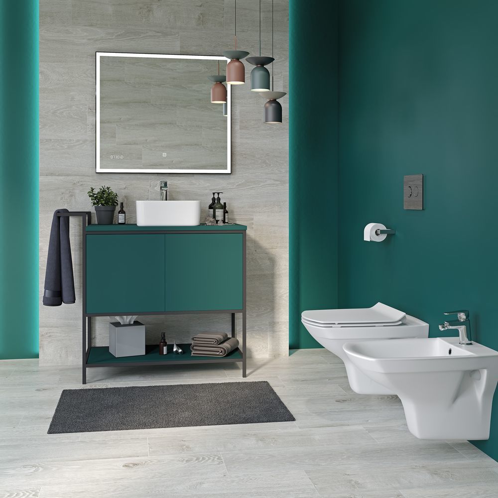 Инсталляция Vector с подвесным безободковым унитазом Carina Xl Co Dpl Eo Slim с ультратонким антибактериальным сиденьем из дюропласта с функцией плавного закрывания и легкосъемом, и кнопкой смыва Blick цвета хром матовый.